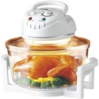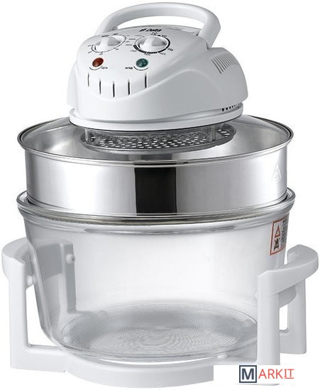 Аэрогриль - многофункциональный бытовой прибор, предназначенный для приготовления пищи в бытовых и аналогичных им условиях.В аэрогриле реализована технология конвективного обогрева - термической обработки продуктов потоком горячего воздуха.Чаша из высококачественного жаропрочного стекла.Расширительное кольцо, предназначенное для увеличения полезного объема аэрогриля при приготовлении крупной птицы, рыбы, больших кусков мяса (например, свиной ноги), а также для стерилизации банок и приготовления нескольких блюд одновременно.При использовании кольца-расширителя объем чаши становится больше на 5 л, а время приготовления необходимо увеличить на 15 минут.Световые индикаторы работы и нагрева.Съемный сетевой шнур.Высокая решетка.Низкая решетка.Щипцы-ухваты для извлечения решетки.Тип управления - механический.Регулируемая температура приготовления.Таймер на 60 минут.Автоматическое поддержание температуры.Режим самоочистки.Автоматическое отключение при поднятии ручки.