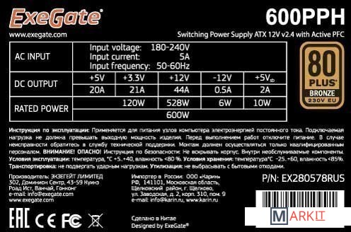 Markit » Блоки питания » Блок питания ExeGate 600PPH 80 Plus Bronze EX280578RUS