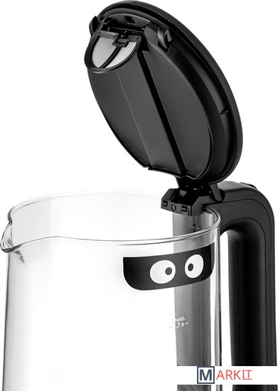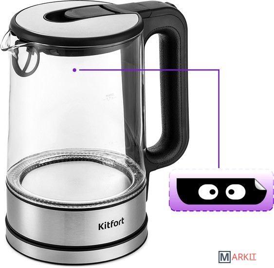 Чайник Kitfort КТ-6128 выполнен из сочетания материалов - стекла, пластика, нержавеющей стали и кожзаменителя. Мерная шкала нанесена на прозрачную часть корпуса. За счёт минималистичного дизайна он идеально впишется в любой интерьер.Кнопка открывания крышки расположена на самой крышке. Если кнопку потянуть в сторону ручки, крышка легко поднимается вверх. Для закрытия крышки нужно просто надавить на неё и опустить вниз до щелчка.Ручка чайника пластиковая с вставкой из кожзаменителя на внутренней части, что позволяет комфортно и удобно держать чайник в руке, не боясь, что он выскользнет.При включении чайника по периметру дна загорается подсветка, которая является индикатором работы и одновременно художественно подсвечивает воду.С нашей техникой очень легко подружиться, потому что она не только лёгкая и функциональная, но и будто живая с весёлыми глазами. Никого не оставит равнодушным. В любой момент вы можете отклеить этот стикер без вреда для поверхности.