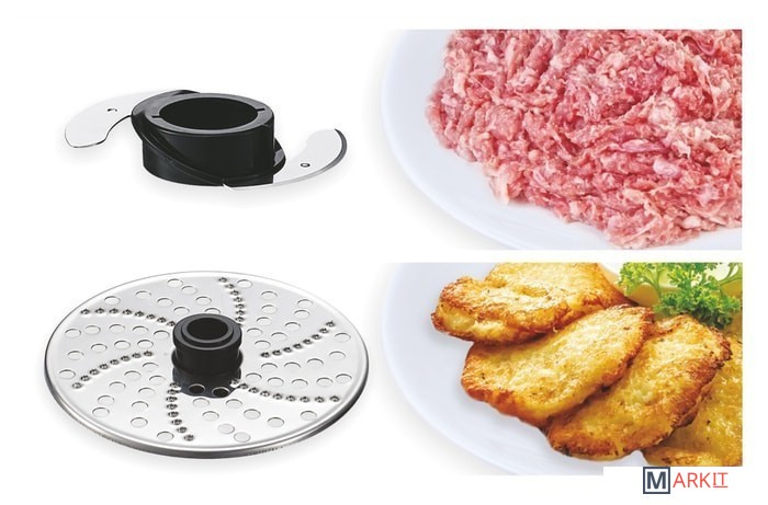 | Функции | взбивание, смешивание, измельчитель, рубка, терка, шинковка, ломтерезка, драники |
