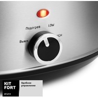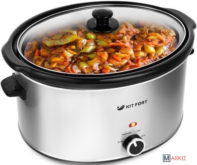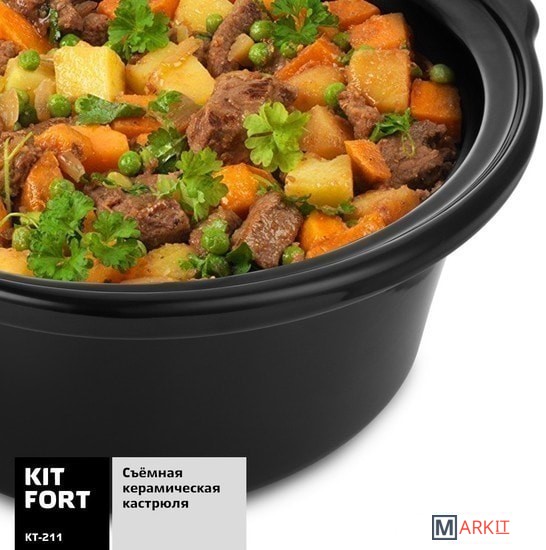 Медленноварка Kitfort KT-211 — это простой в пользовании кухонный прибор с большим диапазоном применения. Она состоит из двойного корпуса, внутри которого по периметру расположены нагреватели, и керамической кастрюли с крышкой. Если в обычной кастрюле пища варится, а на сковородке жарится, то в медленноварке происходит немного другой процесс — томление. Температура приготовления лежит в диапазоне 60–120°С в зависимости от режима и особенностей готовящегося блюда. Благодаря такому температурному диапазону вода почти не испаряется, а продукты медленно тушатся в собственном соку, сохраняя практически все витамины и полезные микроэлементы.2 режима нагрева + подогрев уже готовой пищи.