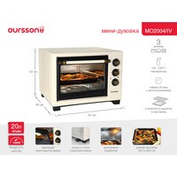 Компактная электрическая мини-печь OURSSON MO2004 объемом 20 литров станет отличным решением даже для маленькой кухни. Печь оптимальна по функционалу и комплектации, проста в управлении, занимает мало места. Благодаря регулировке температуры от 100 до 240 градусов и трем режимам работы можно приготовить любое блюдо: от аппетитной курицы до вкусного, рассыпчатого печенья к чаю. Таймер на 90 минут со звуковым сигналом известит о завершении работы, а функция автоотключения не даст подгореть блюду. В комплекте есть решетка и эмалированный противень.