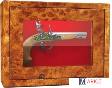 Оружейный взломостойкий сейф с боковыми стенками и застекленной дверью. Многослойное пуленепробиваемое стекло, толщина которого 22 мм, трехсторонняя ригельная система с ручным приводом. Внутренняя отделка — зеленый мокет. Предусмотрено крепление к стене и к полу.