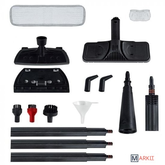 | Дополнительные насадки и приспособления | Щетка для полаТкань для полаОбтяжка на маленькую щетку для сбора грязиЩетка с нейлоновой щетинойАдаптерМаленькая щетка с аксессуаром для мытья оконКонцентратор параПаровая насадкаВоронка |