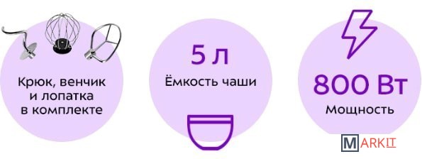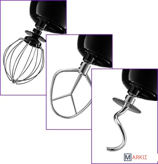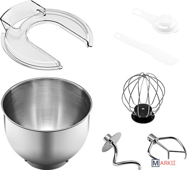 Полная комплектация - моторный блок;- чаша миксера;- крышка чаши миксера;- венчик для сбивания;- насадка для смешивания;- крюк для замеса теста;- лопатка;- сепаратор для яиц;- руководство по эксплуатации;- гарантийный талон.