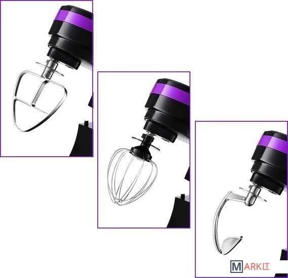 - моторный блок;- чаша миксера;- крышка чаши миксера;- венчик для сбивания;- насадка для смешивания;- крюк;- руководство по эксплуатации. |
