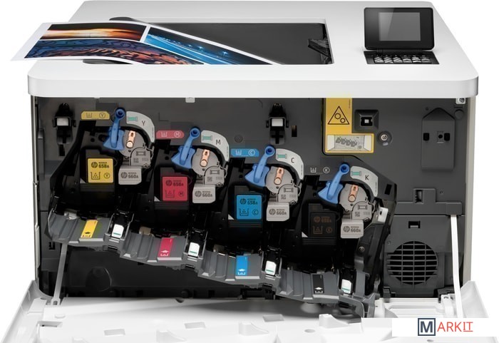 - Принтер HP Color LaserJet Enterprise M751dn; - 4 картриджа HP LaserJet (по одному каждого цвета: черный, голубой, желтый, пурпурный);- руководство по началу работы; - кабель питания;Кабель USB приобретается отдельно!